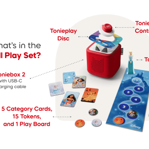 Everything they need to listen. grow and play in a whole new way with Toniebox 2. This Play Set comes with a Disney Frozen: Elsa Tonie figurine. the Disney: Quiz Kingdom Game Tonieplay game. Tonieplay Controller and a Sky Blue Toniebox 2.