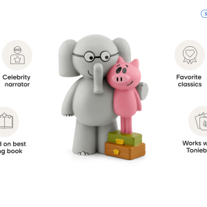 This Tonie features a playful mash up of songs from the hit Elephant and Piggie musical with five fan-favorite stories performed by Tony Award winners Jessie Mueller and James Monroe Iglehart. Get ready to experience Gerald and Piggie like never before!